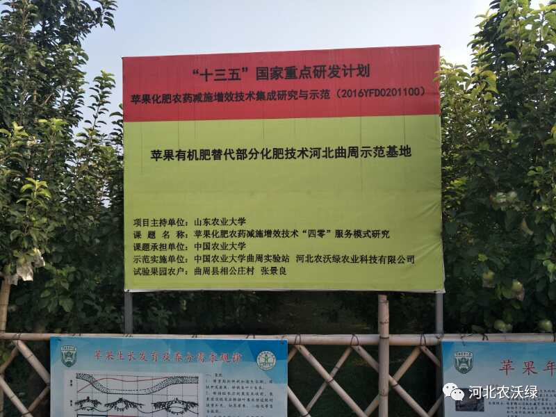 快到果園的時(shí)候,遠(yuǎn)遠(yuǎn)看見一個(gè)豎立起來(lái)大的牌子,牌子上寫了一行大字“十三五”國(guó)家重點(diǎn)研發(fā)計(jì)劃?磥(lái),村民所言非虛!這更激起了筆者的好奇心,又往前走進(jìn)了一些,“蘋果有機(jī)肥替代部分化肥技術(shù)河北曲周示范基地”的字樣也就映入了眼簾。似乎看出來(lái)筆者心理的疑惑,張大哥這才笑呵呵的講起這片果園故事的由來(lái)。