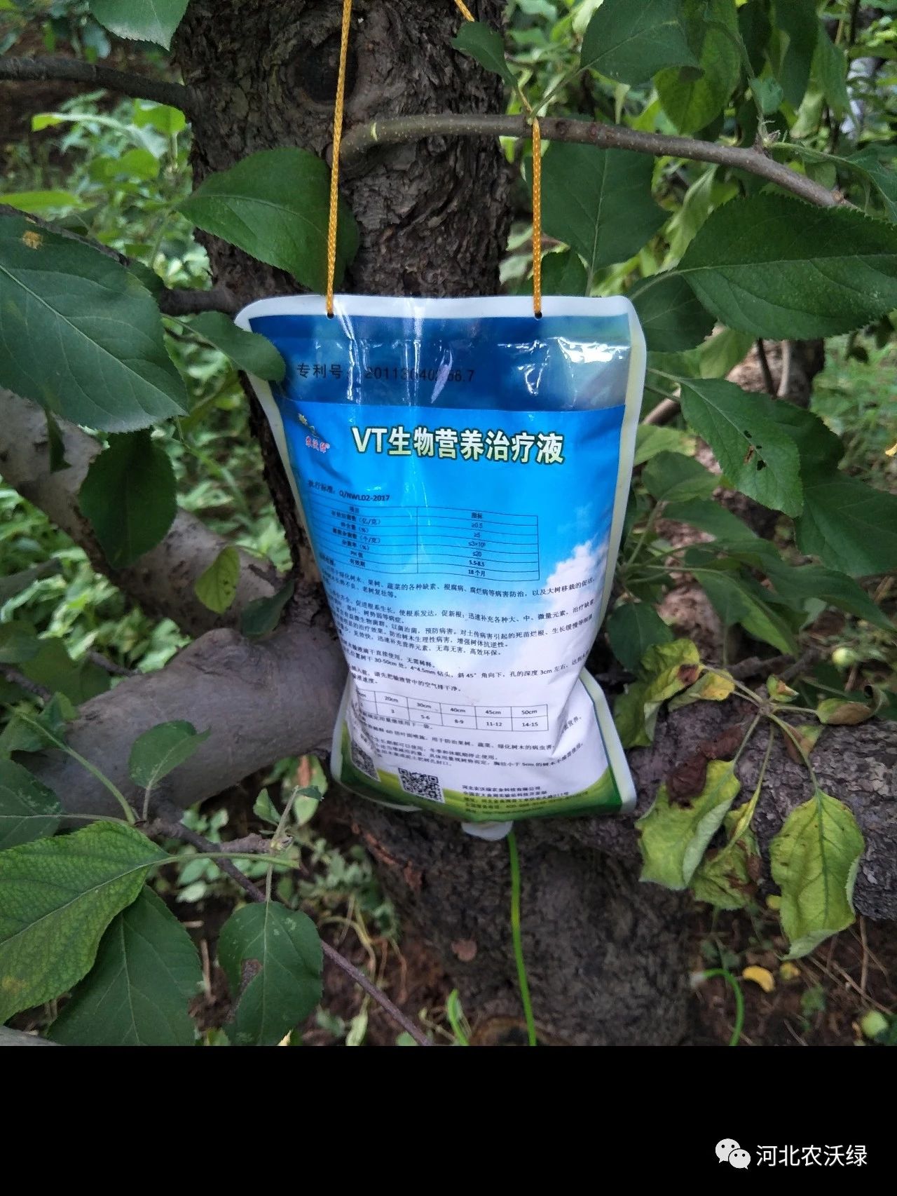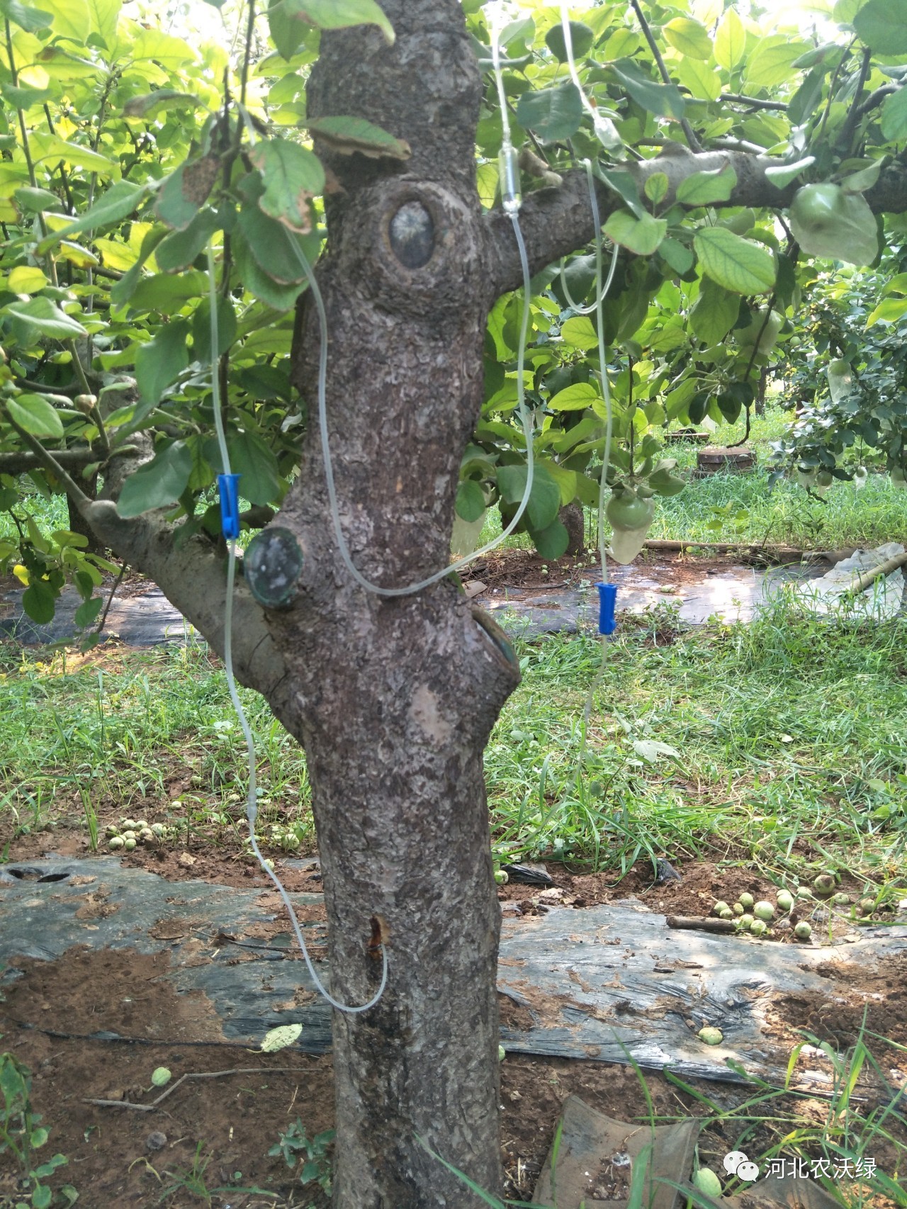 按照工作人員的指導(dǎo)施肥和管理后張大哥覺得果園今年長(zhǎng)勢(shì)比往年要好,掛果量也明顯增多了?吹叫Ч髲埓蟾缬致(lián)系了工作人員,希望對(duì)方能幫助他解決蘋果葉片黃化問題,很快就有工作人員來(lái)果園了解情況,并向他推薦了使用農(nóng)沃綠VT營(yíng)養(yǎng)治療液給果樹輸液的方案,可以對(duì)果樹黃化采取輸液滴干治療的方式解決果樹病癥。