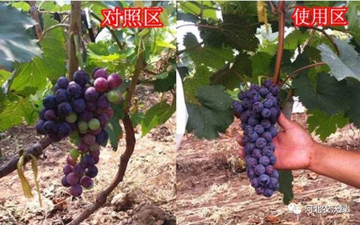 使用農(nóng)沃綠含腐殖酸水溶肥與其他肥料對(duì)比:葡萄坐果率高、上色均色,果實(shí)飽滿