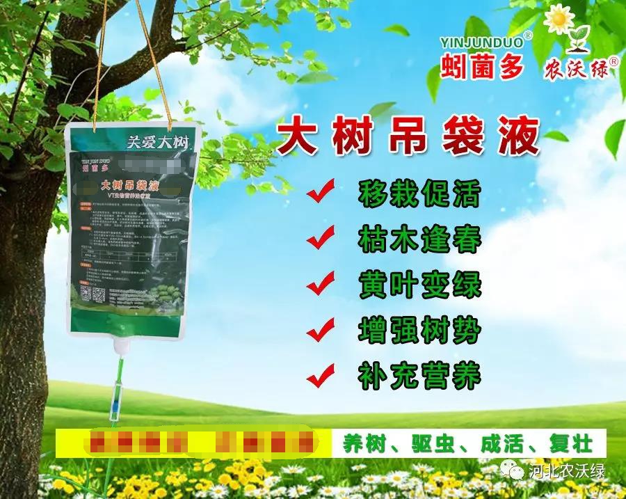 移栽后一般采用支架支撐牢固,樹木要用架桿支撐牢固達到整齊美觀實用,防止樹木歪斜。同時使用“農(nóng)沃綠大樹吊袋液”對樹木進行輸液,補充營養(yǎng),增強樹勢,從而提高移栽成活率。