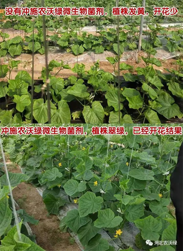 確定原因后,公司經(jīng)理建議沖施農(nóng)沃綠微生物菌劑,一畝地沖施一壺,改善土壤透氣性,促進瓜苗生長,當天下午在公司經(jīng)理的指導下就沖施上了。近期,我們又來到張大哥的大棚,再次相見,張大哥完全沒有了之前的愁容滿面,一臉高興啊,再看棚內(nèi)情況,瓜苗綠油油的長勢特別旺盛,莖稈粗壯,刨開根部,毛細根數(shù)量明顯增多,而且根系發(fā)達。張大哥說:“沖施你們這個微生物菌劑后,我天天觀察,大概在5.6天的時候發(fā)現(xiàn)已經(jīng)有新葉開始生長了,刨開根部,已經(jīng)滋生了很多毛細根,之后一直觀察,到現(xiàn)在植株翠綠,很健康,甚至比另一側(cè)的開花還要早還要多呢”。