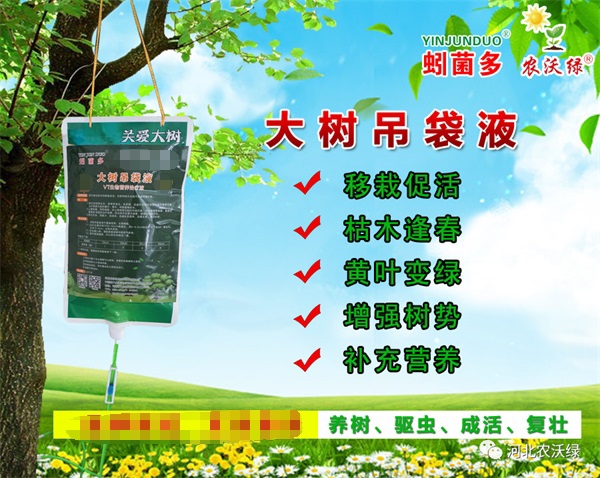措施:衰老的行道樹由于受特定的環(huán)境限制,養(yǎng)分的供給較少,因此對這類樹木應補充養(yǎng)分,有效施肥?墒褂棉r沃綠大樹吊袋液給樹體輸液,迅速補充樹體所需養(yǎng)分,促進根系生長,使根系發(fā)達,生新根,同時可治療缺素引起的黃葉、落葉、樹勢弱等癥狀。