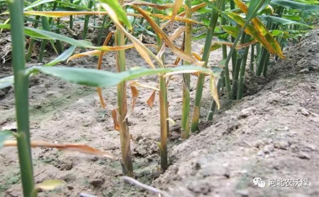 大姜莖基腐病俗稱爛脖子,是一種真菌性病害,主要在高溫高濕的情況發(fā)生較為嚴(yán)重,以菌絲體在病株殘?bào)w中和染病姜塊中或土壤中越冬。該病主要危害莖桿,使水分養(yǎng)分運(yùn)輸受阻,莖桿由上到下干枯死亡,造成死棵現(xiàn)象。