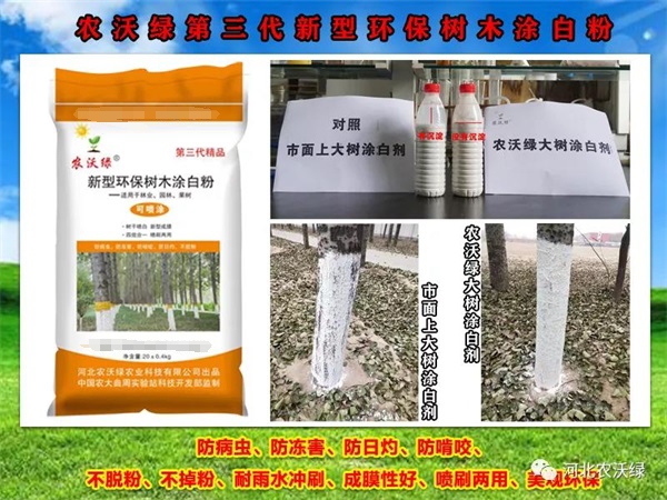 刮掉老皮后應(yīng)及時(shí)涂白,可以消滅在樹干上越冬的病蟲,防治凍害。推薦使用農(nóng)沃綠第三代精品樹木涂白粉,它是農(nóng)沃綠公司和農(nóng)大專家采用納米技術(shù)共同研發(fā)的又一環(huán)保新產(chǎn)品,成膜性好,粘著牢固不脫落,防病蟲、防凍害、防啃咬、防日灼,四效合一,保護(hù)全面。噴刷兩用,持久美觀。