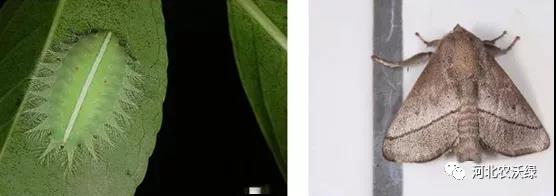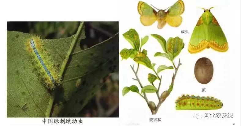 扁剌蛾:體扁、橢圓形,背部稍隆起,形似龜背。全體綠色或黃綠色,背線白色。體兩側(cè)各有10個瘤狀突起,其上生有刺毛,每--體節(jié)的背面有2小叢刺毛,第四節(jié)背面兩側(cè)各有-紅點。