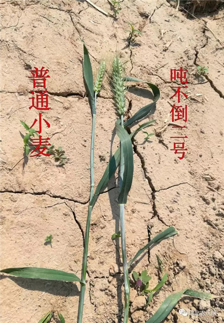噸不倒2號小麥沒有出現(xiàn)倒伏,相鄰地塊種植的普通小麥倒伏嚴重