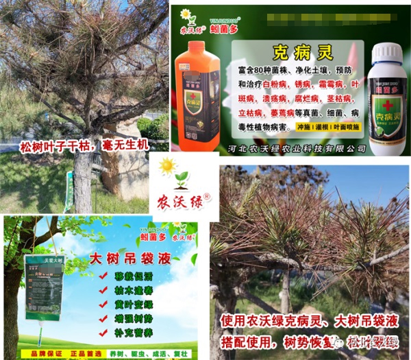 松樹(shù)使用農(nóng)沃綠克病靈、大樹(shù)吊袋液前后對(duì)比