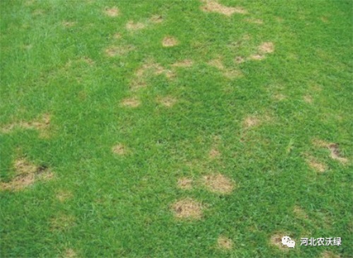 褐斑病是一種由立枯絲核菌引起的真菌病害。發(fā)病部位多在葉部和莖基部,呈褐色梭形病斑,病斑邊緣紅褐色,中心灰白色。發(fā)病草坪草不倒伏,呈直立狀。當(dāng)草坪出現(xiàn)小型枯草斑塊時,預(yù)示病害即將大面積發(fā)展。