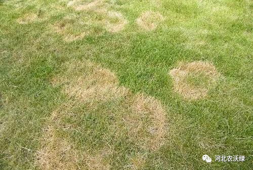 1. 蛙眼狀枯草圈,內(nèi)綠外黃:這是由于褐斑病對根系危害較輕,最早的發(fā)病中心,地上部死亡,但根系未死,根系又重新萌發(fā)新的幼苗,并逐漸恢復(fù),而發(fā)病中心的外圍卻依然在擴大,便呈現(xiàn)出內(nèi)綠外黃的枯草圈。在修剪較高的多年生黑麥草、草地早熟禾、高羊茅草坪上,通常沒有煙圈。